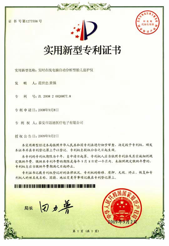 公司研發(fā)的電腦自動分析型胎兒母嬰監(jiān)護儀,獲得國家發(fā)明專利,2011年榮獲國家科技部創(chuàng)新技術產品,該產品解決了婦產科醫(yī)護人員 普遍不會胎兒監(jiān)護圖形分析診斷的困惑,極大促進了胎兒監(jiān)護的臨床應用與發(fā)展!開創(chuàng)了中國胎兒監(jiān)護自動分析新時代!市場前景極其廣闊!