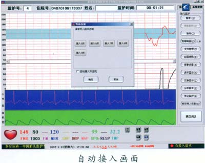 床邊機(jī)一開機(jī)進(jìn)入監(jiān)護(hù)狀態(tài),孕婦的住院號、姓名及各種監(jiān)護(hù)信息自動的傳到中央監(jiān)護(hù)主機(jī)上,自動啟動中央監(jiān)護(hù)工作站開始監(jiān)護(hù),監(jiān)護(hù)結(jié)束后自動存儲監(jiān)護(hù)信息,  實(shí)現(xiàn)了自動監(jiān)護(hù)無人值班,極大方便了臨床應(yīng)用。