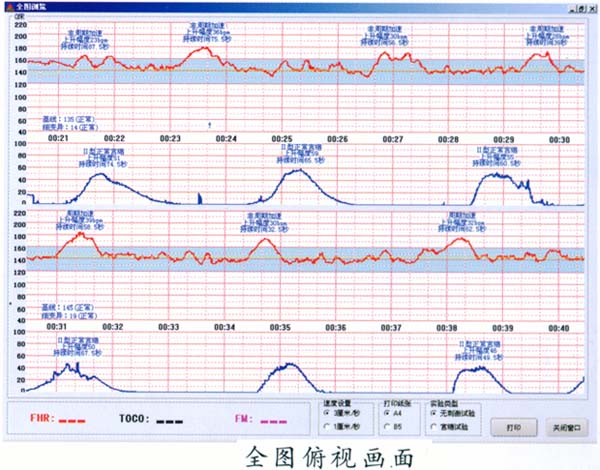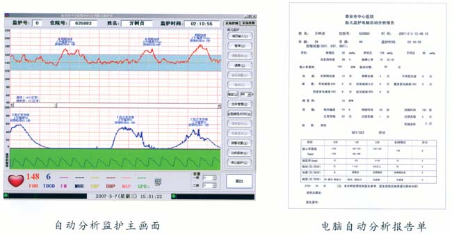 在監(jiān)護(hù)中對胎心率基線、細(xì)變異大小、加速、各種減速及胎動的變化進(jìn)行實(shí)時在線分析,并將分析結(jié)果顯示在屏幕上,監(jiān)護(hù)結(jié)束時對所有的監(jiān)護(hù)信息進(jìn)行綜合分析,給出監(jiān)護(hù)診斷結(jié)果及胎兒評分供臨床參考,使得每個婦產(chǎn)科大夫都能輕松進(jìn)行胎兒監(jiān)護(hù)圖形分析和診斷。