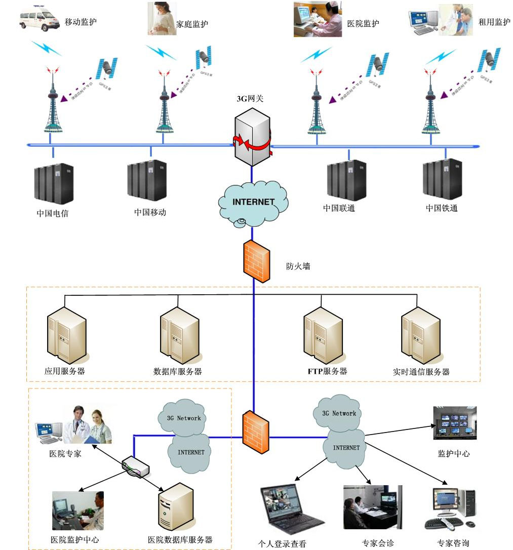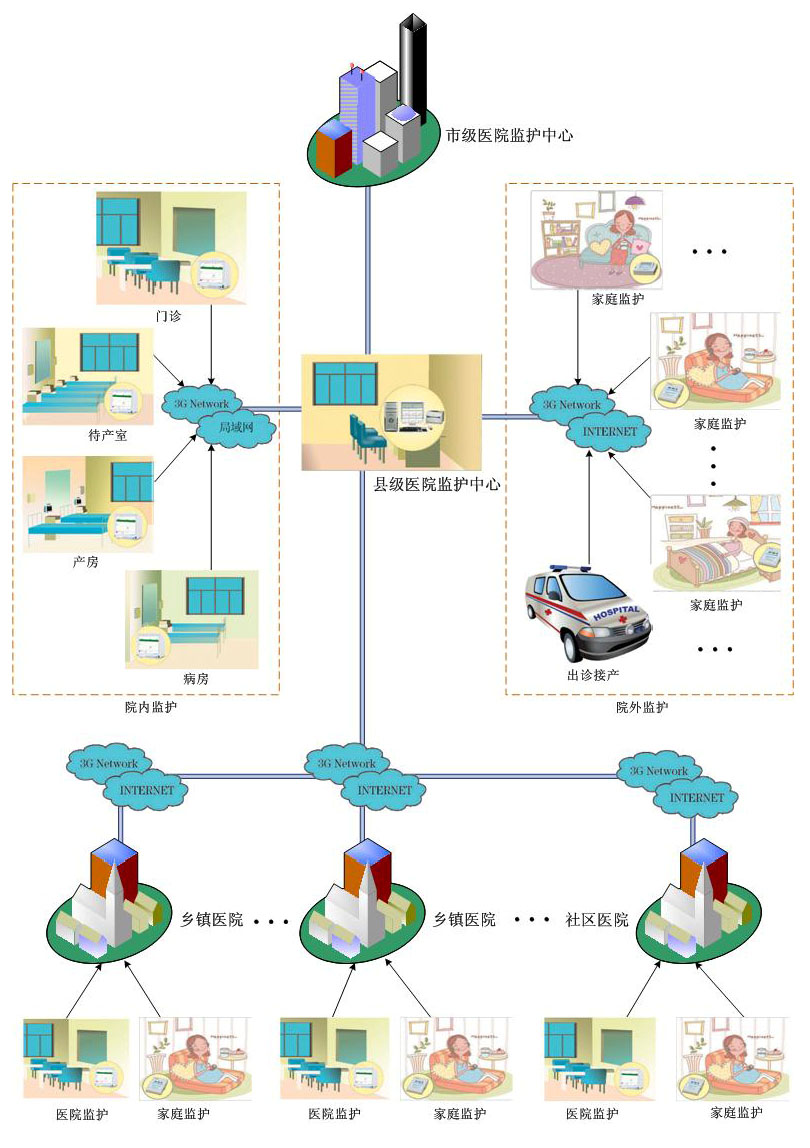 無線遠(yuǎn)程母嬰監(jiān)護(hù)網(wǎng)絡(luò)系統(tǒng),可同時(shí)將縣級醫(yī)院與多家鄉(xiāng)鎮(zhèn)醫(yī)院、社區(qū)醫(yī)院及家庭進(jìn)行聯(lián)網(wǎng),孕婦在鄉(xiāng)鎮(zhèn)醫(yī)院、社區(qū)醫(yī)院及家庭監(jiān)護(hù)的心電、血壓、血氧飽和度、脈搏心率及胎兒的瞬時(shí)胎心率、宮縮壓力、胎動等參數(shù),同時(shí)無線遠(yuǎn)程實(shí)時(shí)傳輸?shù)娇h級醫(yī)院,實(shí)現(xiàn)遠(yuǎn)程監(jiān)護(hù)、遠(yuǎn)程診斷,不受時(shí)間空間距離制約。對同一個(gè)醫(yī)院,可實(shí)現(xiàn)門診、監(jiān)護(hù)室、病房、分院、樓層距離遠(yuǎn)聯(lián)網(wǎng)需求和資源共享。